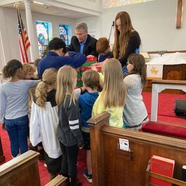 The pastor lead the children of the church in blessing and prayer over the Operation Christmas Child Boxes.